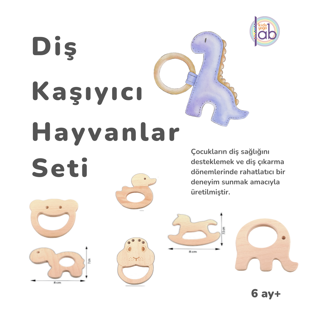 Diş kaşıma süreci geçiren bebekler için üretilmiş 5’li hayvan figürlü diş kaşıma seti, doğal kayın